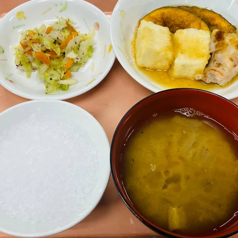 メニューは、揚げ出し豆腐、キャベツのゆかり和え、もやしのみそ汁です。