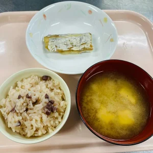 今日の給食は、小豆ごはん、太刀魚の塩焼き、厚揚げのみそ汁です。
